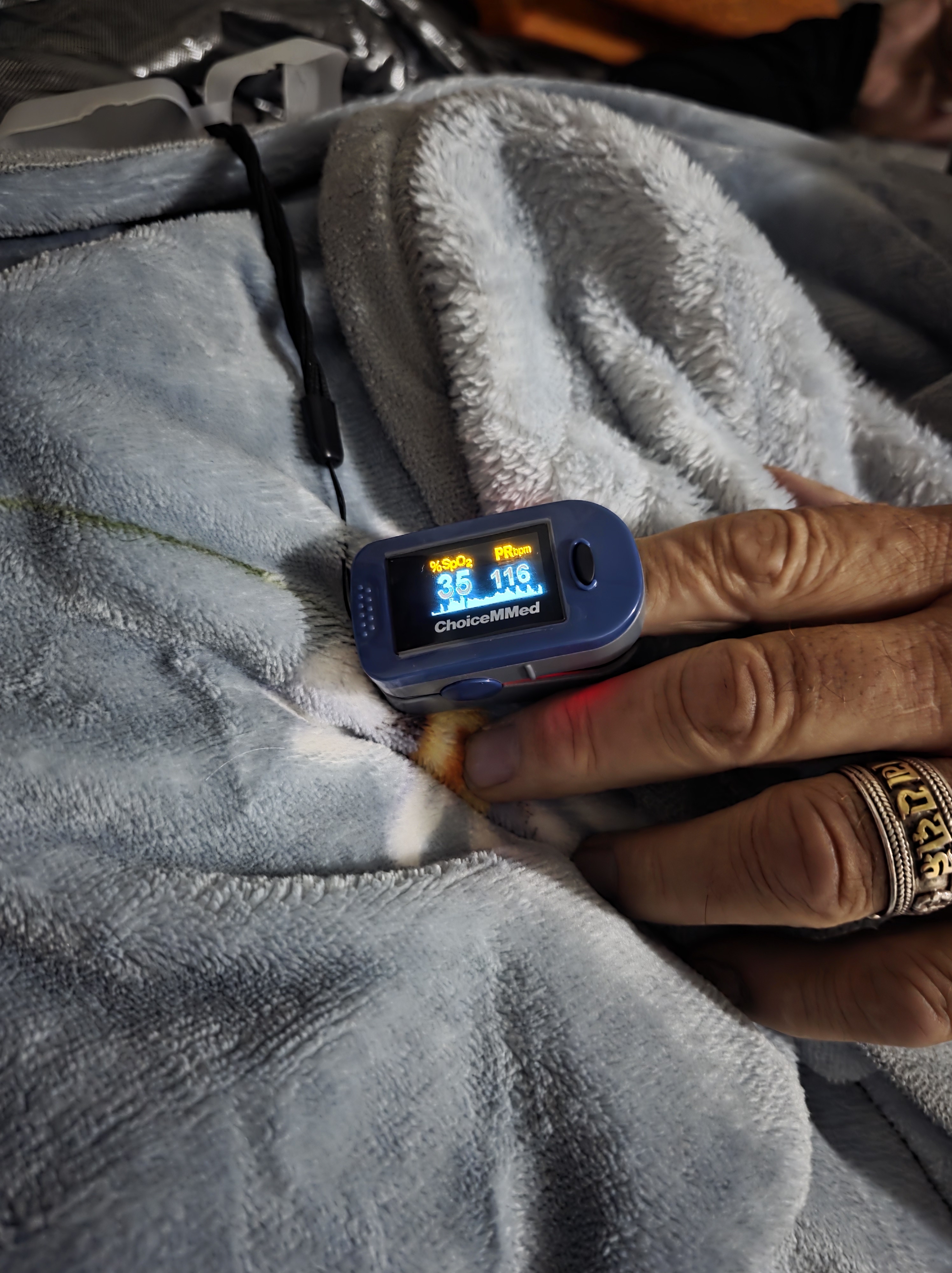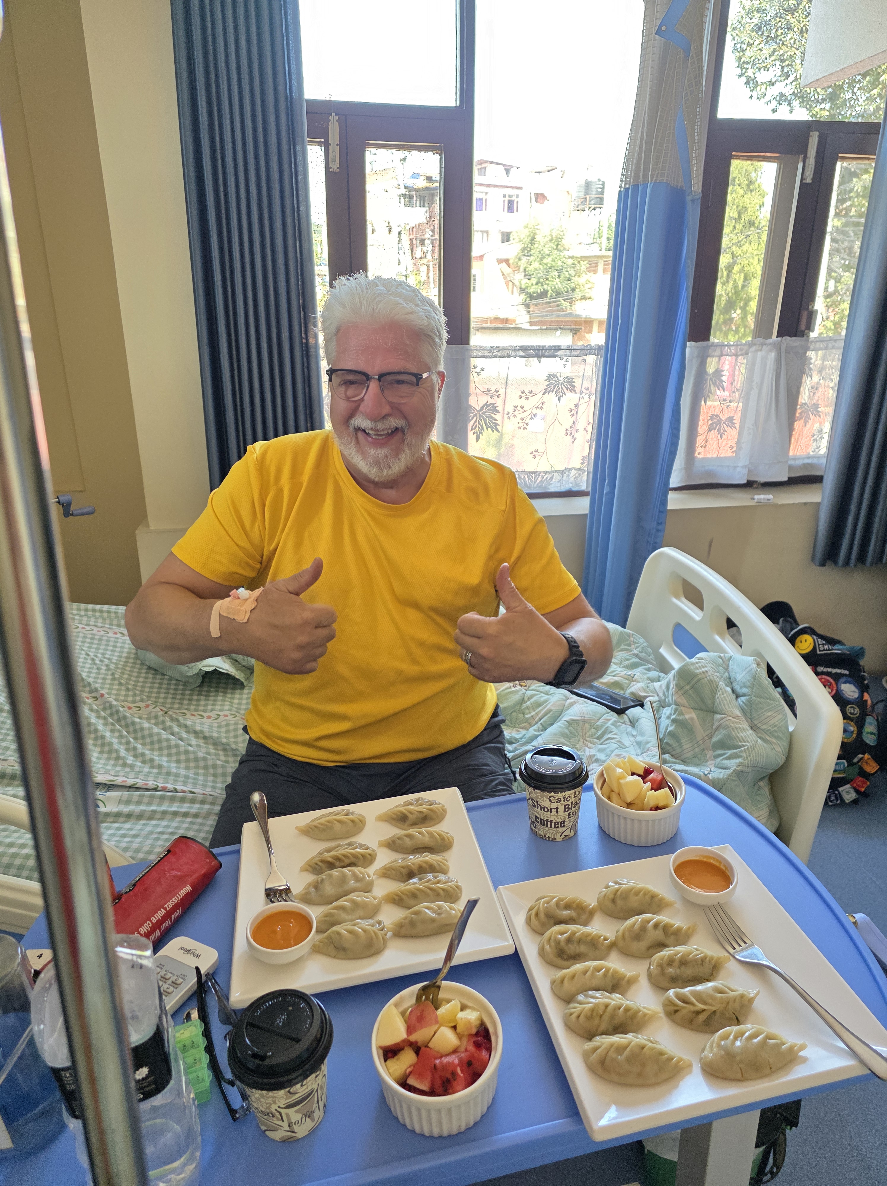 I woke at 4:43am on Oct 9th in need of a washroom and heard the sounds of Jeff’s laboured breathing. He was fully asleep but wheezing and struggling. I hoped he was dreaming about something and would come out of it. He wasn’t, so I found my phone and WhatsApp’ed Bibek, “Bibek we need to get Jeff out here.”. His resting heart rate was 120 and, much to all our shock, his oxygen was 35%. It was 70% at dinner hours earlier.