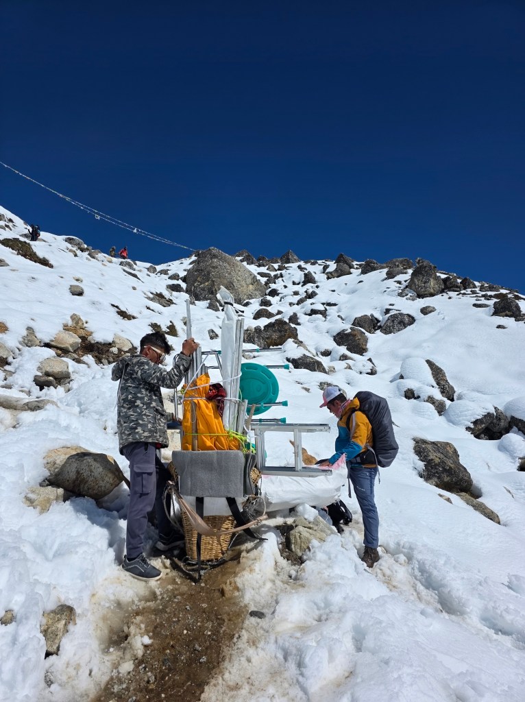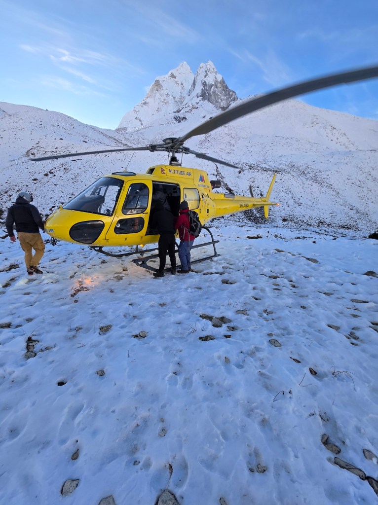 I got Jeff packed and watched as Bibek and Mangla went into action arranging for a helicopter, getting him out of bed and supporting the long walk to the heli pad. In a little over an hour, Jeff was flying to Lukla then Kathmandu.
