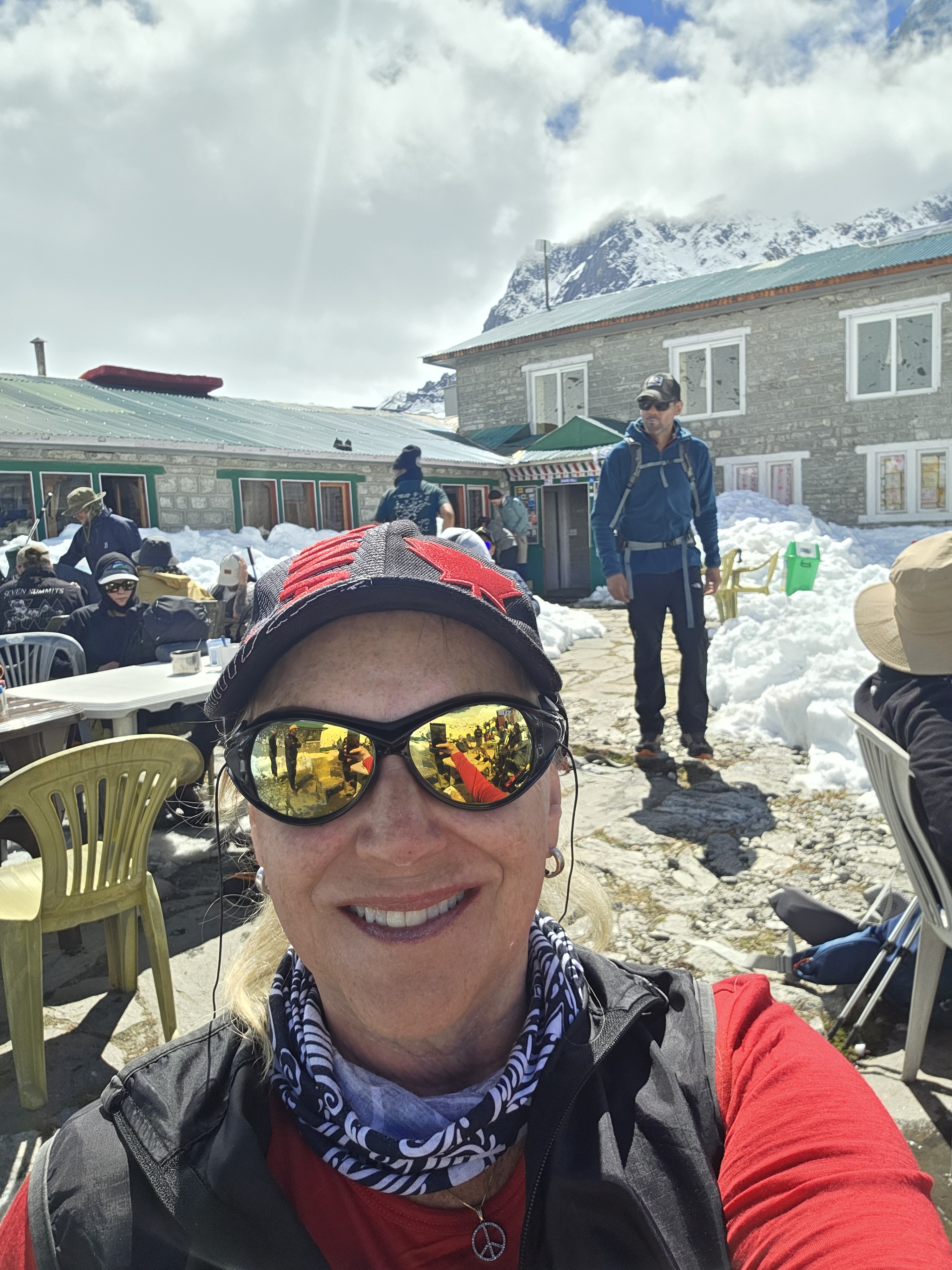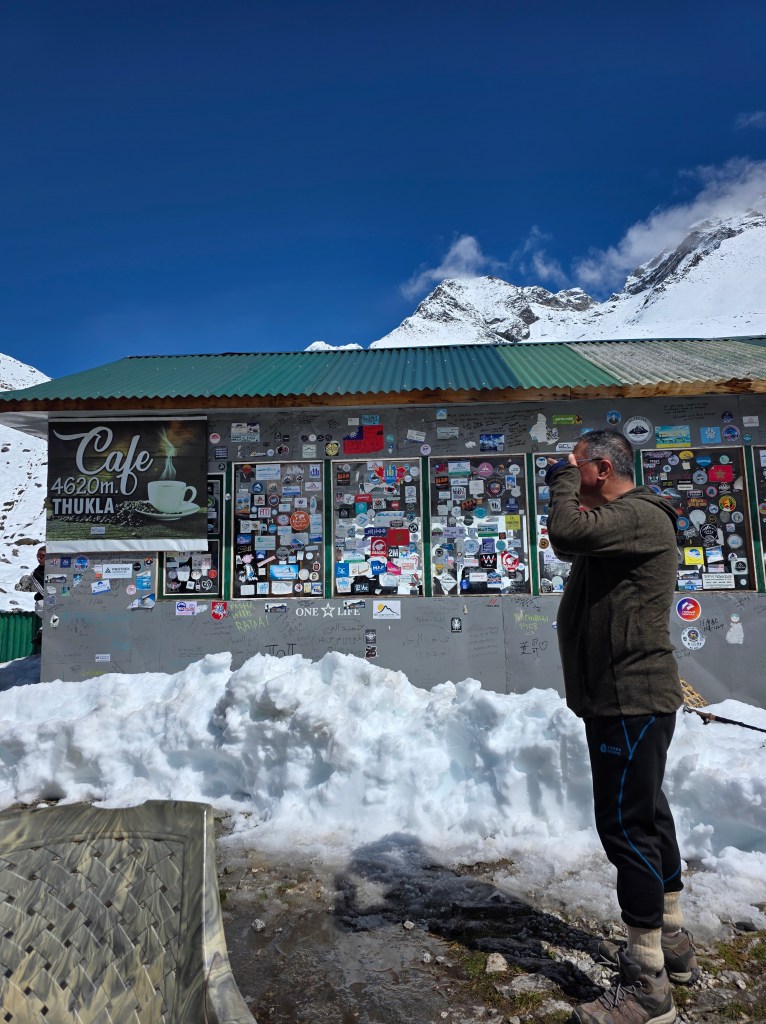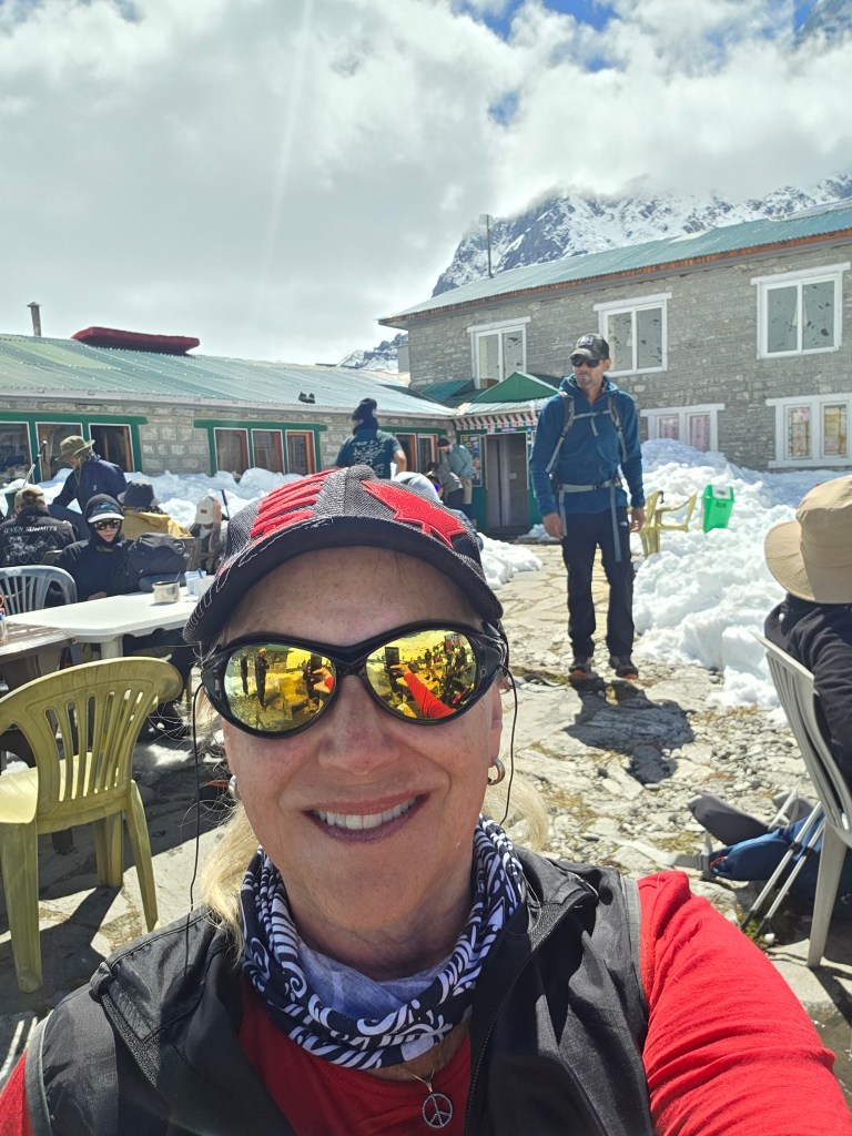 For lunch we stop at a famous lonely ‘cafe’ in the middle of the mountains, Thukla Cafe. It reminds me of a ski chalet without any of the nice stuff but the weather and comradery of other trekkers makes it memorable. There are 2 gentlemen from India approximately our age who we’ve spoken to many times on our trek. They ask where Jeff is, and respond that they are also struggling with the affects.