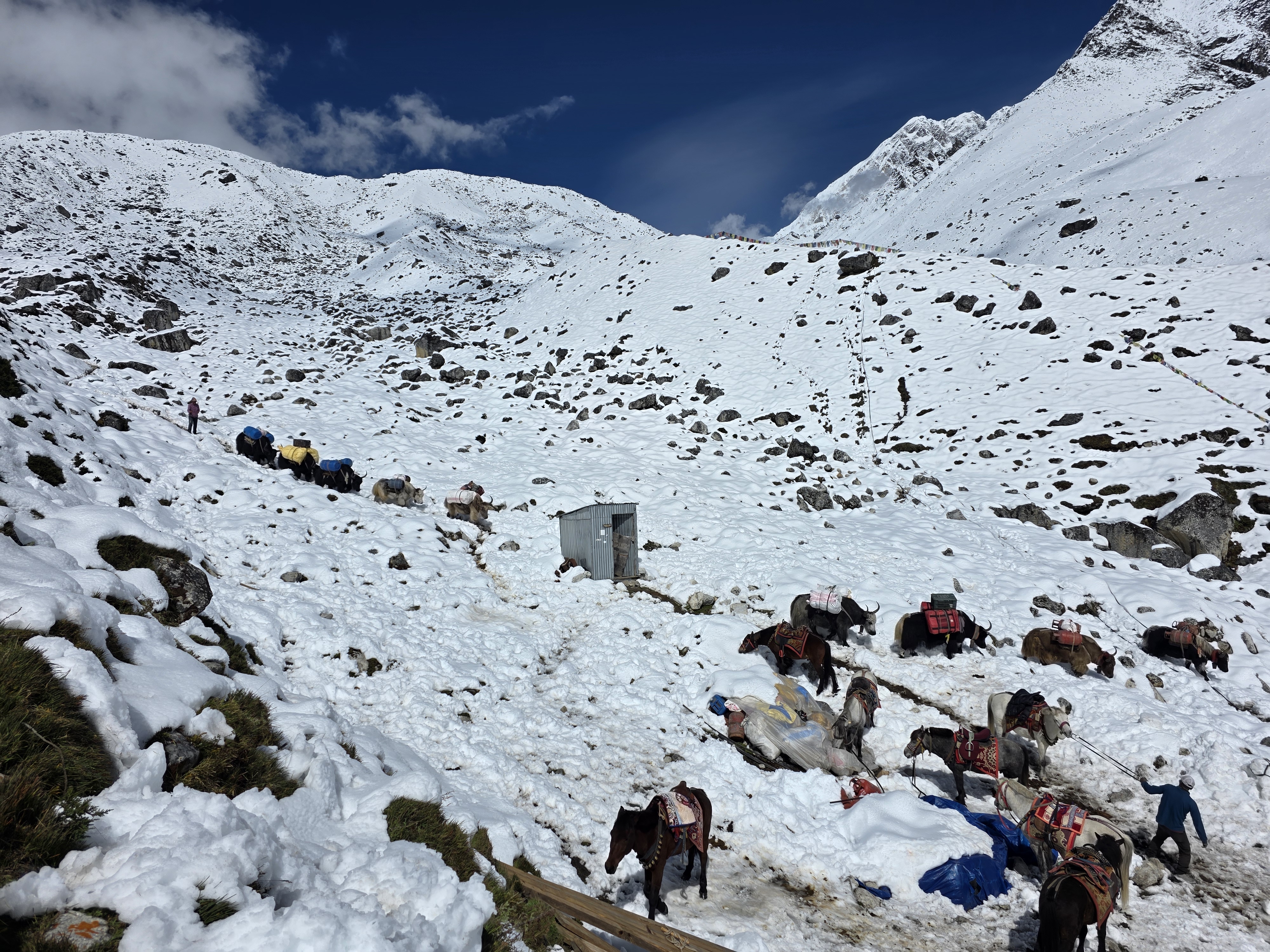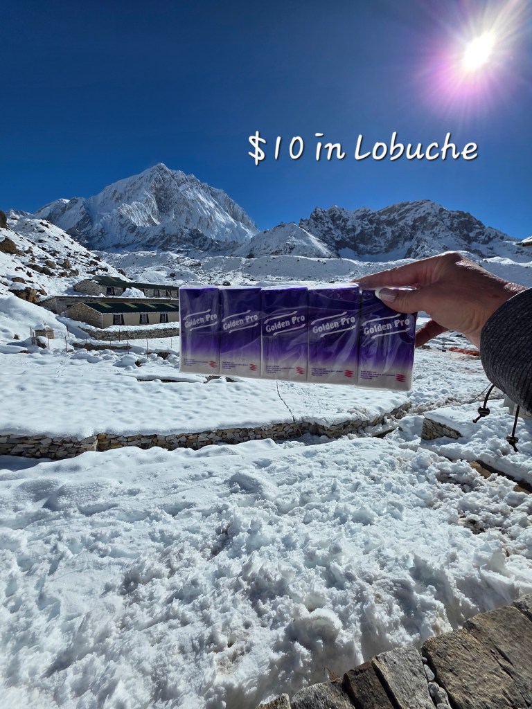 The higher you go the less you get as part of the room fee and the more expensive everything is – toilet paper $5 a roll – tissues $10 a pack. When you see the Porter and Yak photos you begin to understand why it should be more expensive. Everything is carried up and this far up isn’t a place many would want to be.