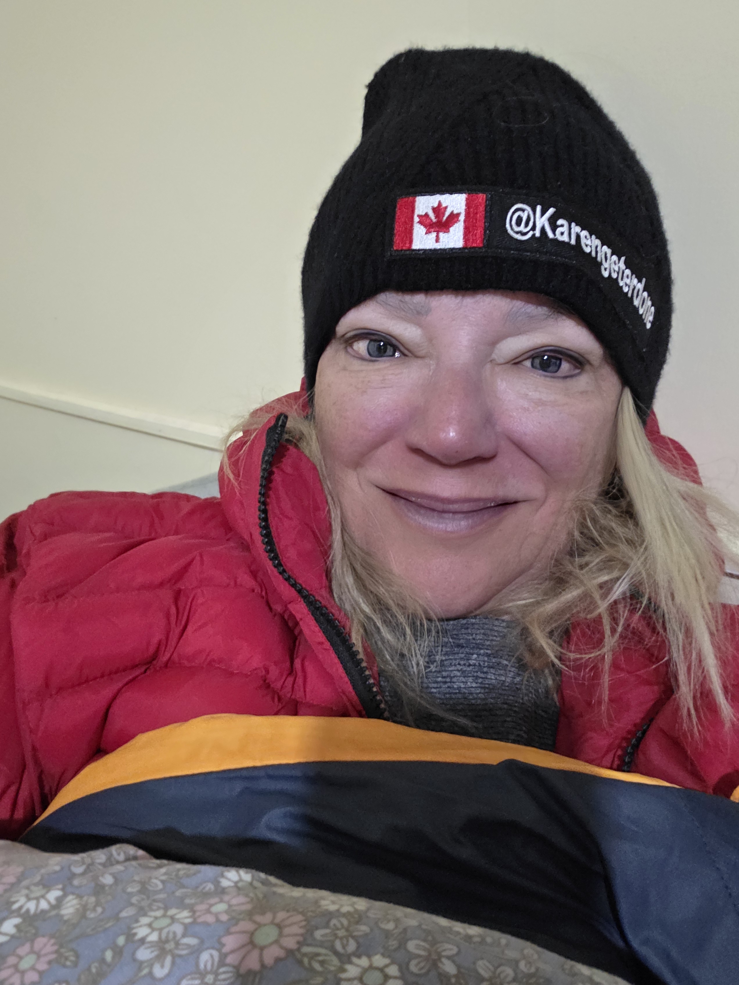 I put on 2 puffer jackets and went to the communal room in hopes of finding some warmth. Nope! Grumpy and not excited.