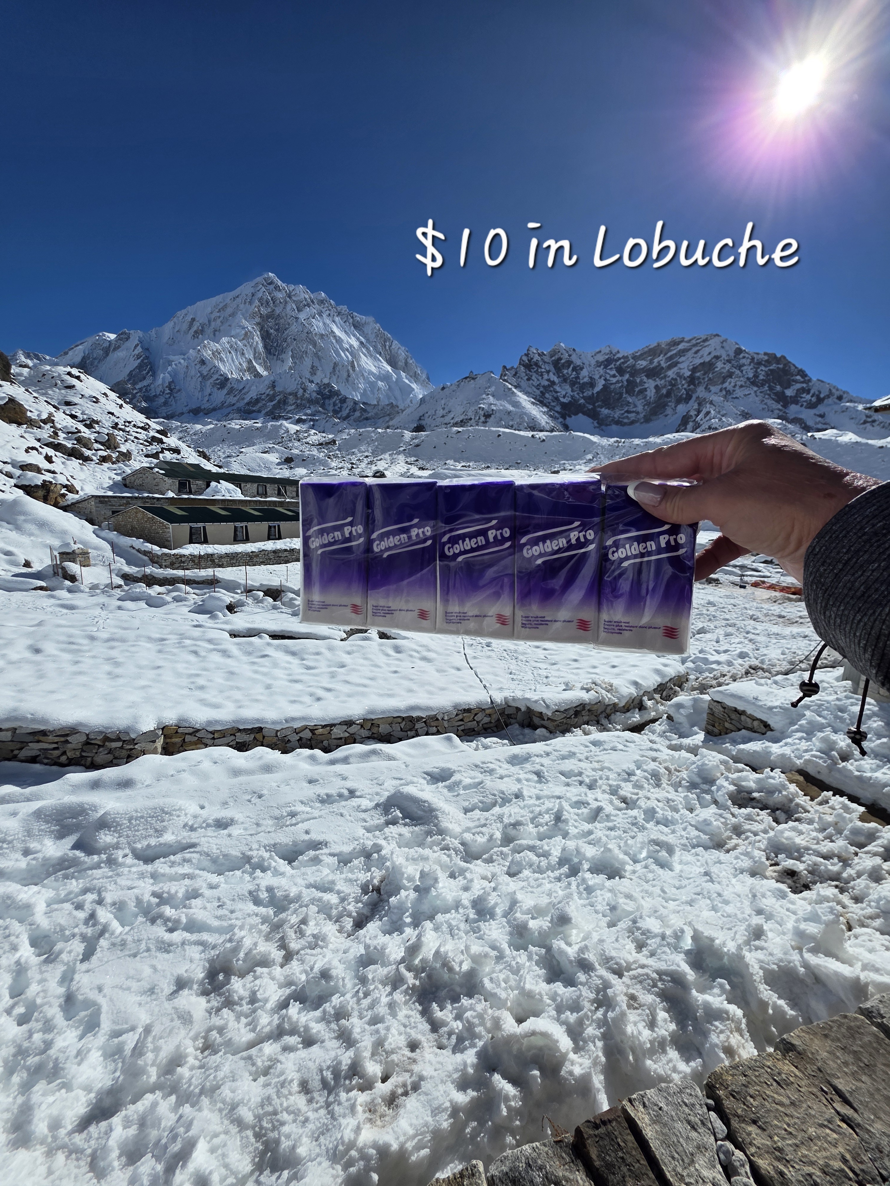 Today I wake to a window so covered in ice that I cannot see out, 2 fully frozen Nalgene bottles, my sweaty, slushy hiking boots are rock hard frozen, even my contact lenses froze in saline. Miserable! Alone! Gorakshep is a hell hole – sorry but that was the thought as I was trying to figure out how to begin my day with frozen frigging boots.
